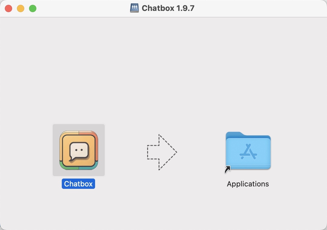 下载的Chatbox-1.9.7.dmg,大小100M多点,点击安装,按下面提示拖到Applications内: