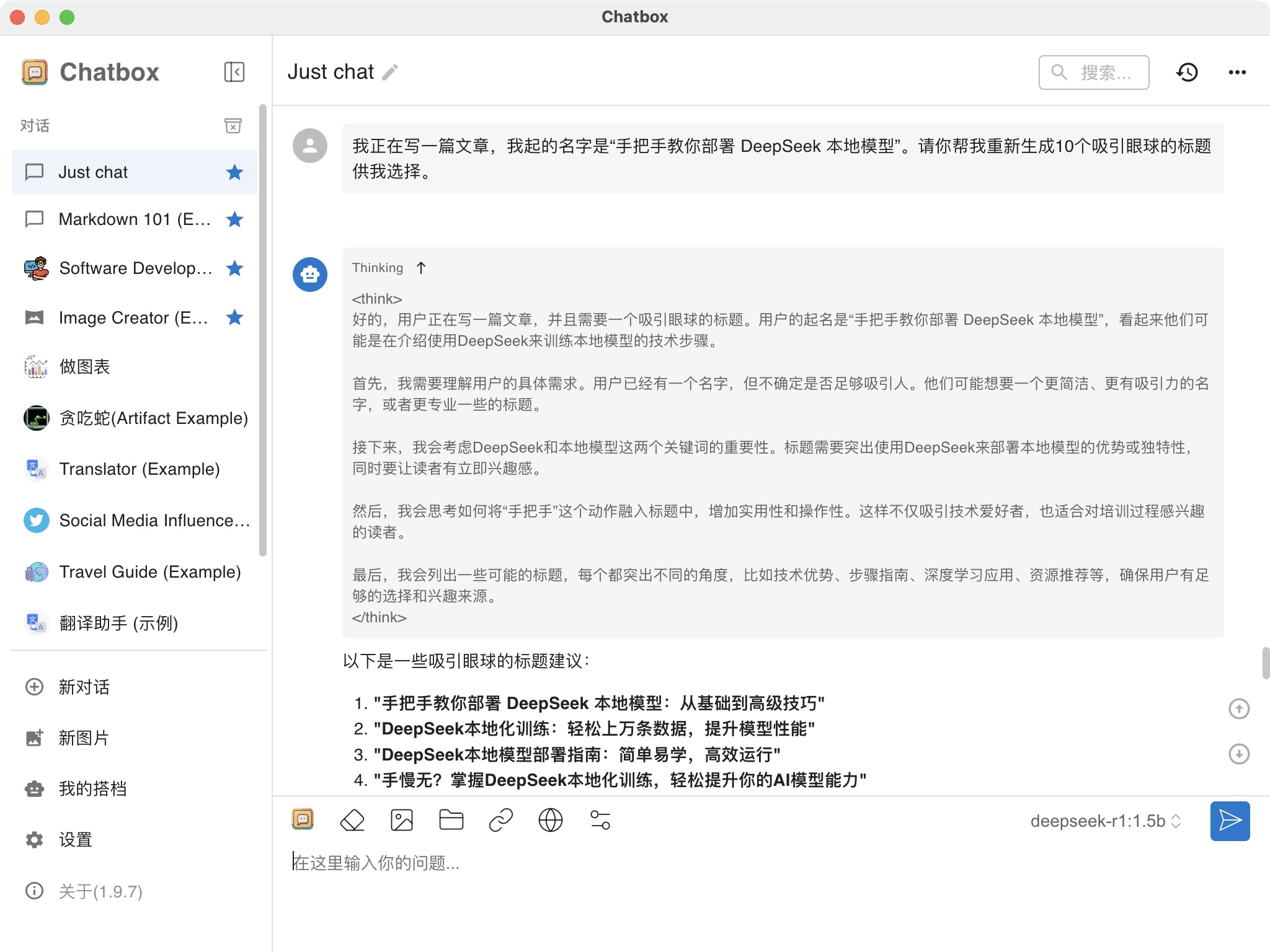 配置好DeepSeek本地模型之后,就可以实现在断网情况下自由问答了,比如,此刻我正在写这篇文章,于是就问他帮我想几个备选的标题: