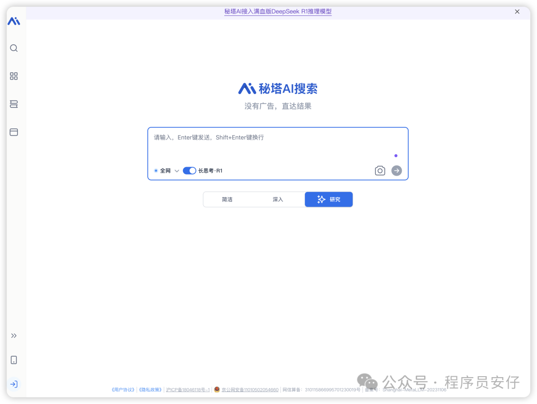 纳米 AI 搜索是一个国内的 AI 搜索引擎,它也支持 DeepSeek R1 模型。