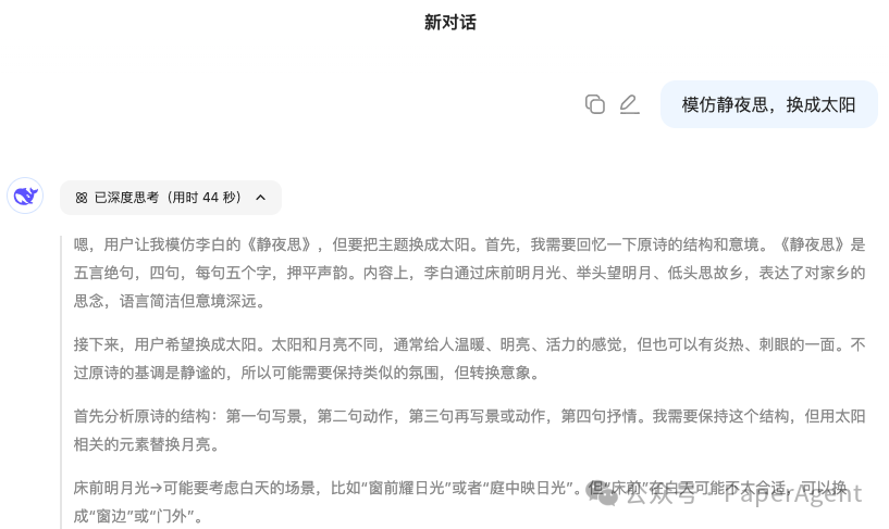 现在,输入:“模仿静夜思,换成太阳”,DeepSeek-R1会自主推理的作用,不指导它如何操作——只指导它是什么。