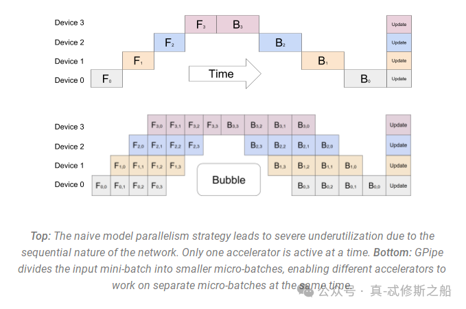 通过将每个批次的训练数据分成更小的微批次(micro-batches),这些微批次可以并行地在流水线的各个阶段中处理。一旦一个阶段完成了一个微批次的前向传递,激活内存就会传递给流水线中的下一个阶段。类似地,当下一个阶段完成了对一个微批次的后向传递,相对于激活的梯度就会通过流水线向后传递。每个后向传递都会局部累积梯度,然后所有数据并行组并行地执行梯度的归约。最后,优化器更新模型权重。