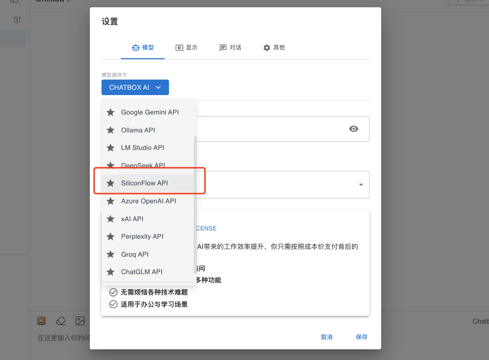 Chatbox AI相当于前端的对话产品,你把硅基流动的API key输入进去,就可以对话了,而且它是目前唯一支持自定义API Key且有Mac、Win、安卓、IOS四端产品的。无敌好吧。