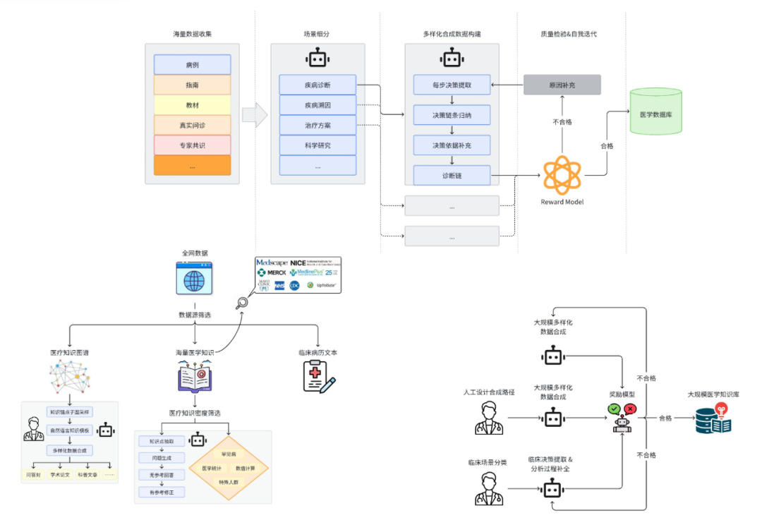 这些合成数据不仅具备多样化的知识呈现形式,并且包含了大量与人类医生真实决策一致的模拟思维过程,显著提升了大模型的医疗推理能力。