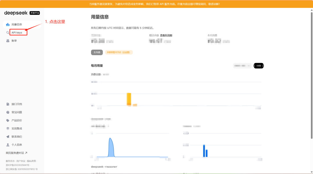 这样,我们的账号就已经注册好了。接下来我们将使用 deepseek R1 模型。昨天 API 开放平台又可以进入了,免费赠送了 10 元额度。