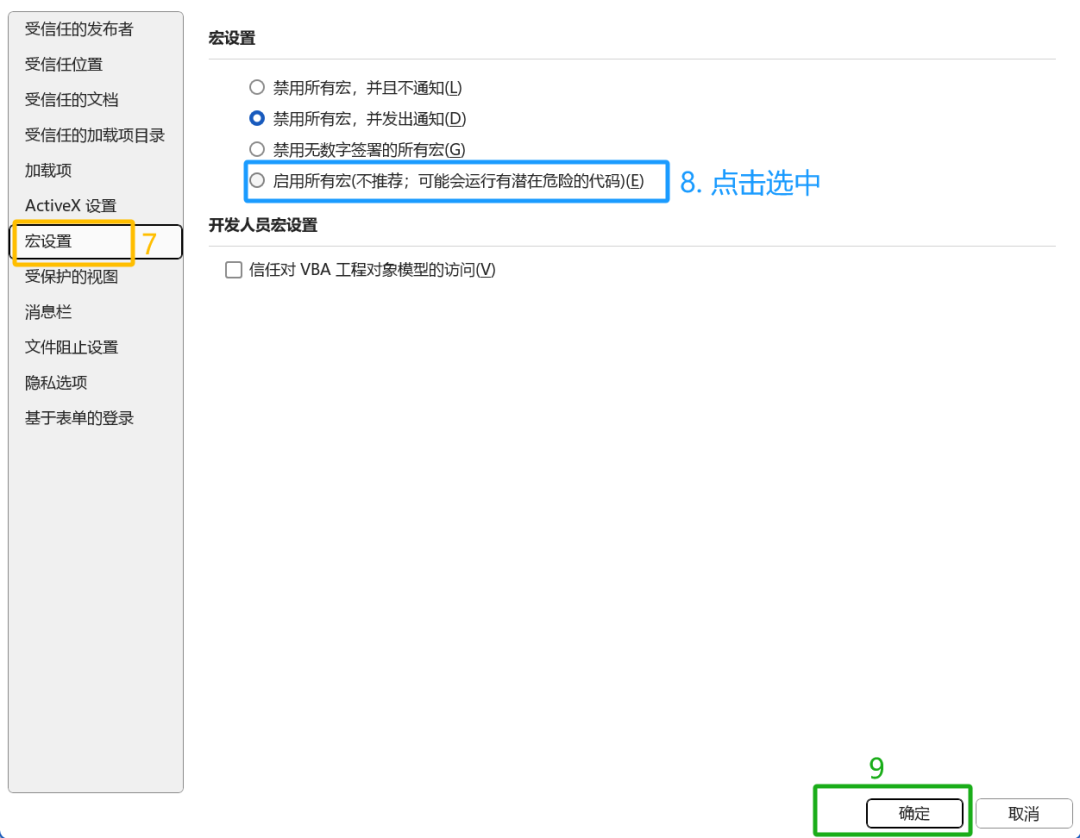 再点击 信任中心 -> 信任中心设置,选择“启用所有宏”与“信任对VBA…”。