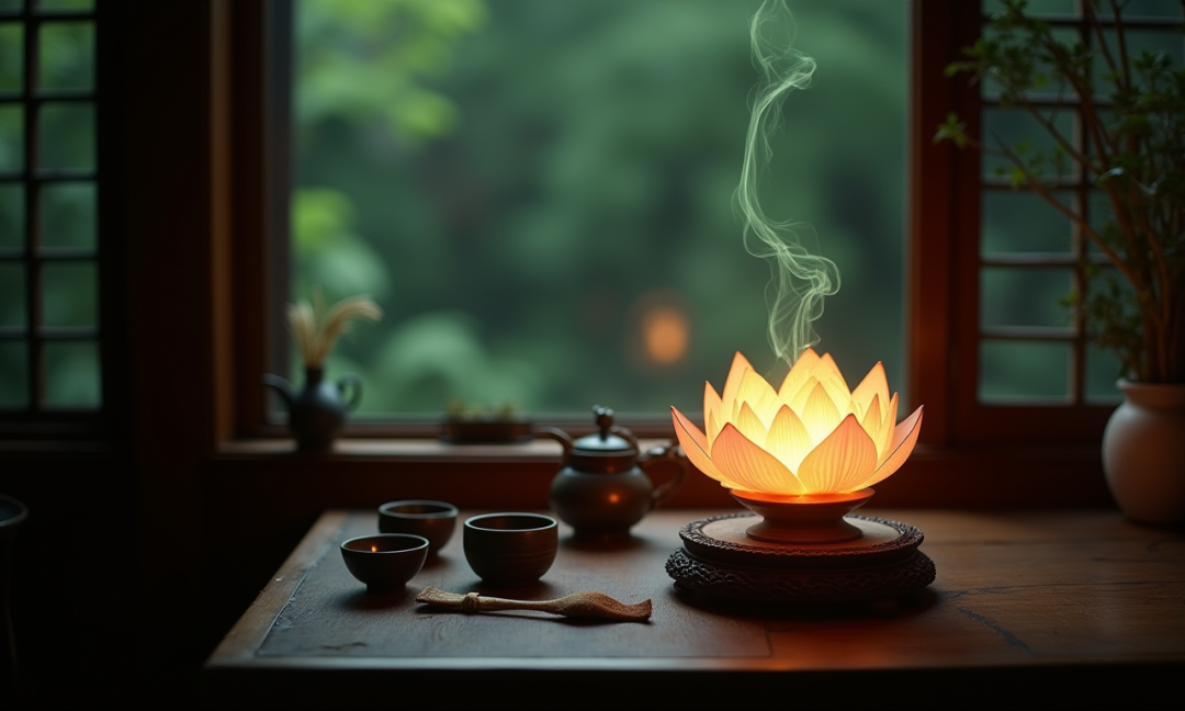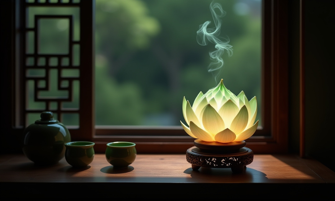 On the wooden table of a windowsill in a dimly lit room, there is a set of traditional Chinese gongfu tea utensils and a lotus lantern meticulously crafted from a semi-transparent material. The lotus lantern rests on an exquisite wooden base, whose surface is intricately carved with fine patterns. The lantern emits a soft and steadfast glow, with each petal of the lotus meticulously detailed. A wisp of green smoke rises from the top of the lotus, forming a complex spiral pattern. Outside the window, the view is a very pleasant Chinese garden landscape.