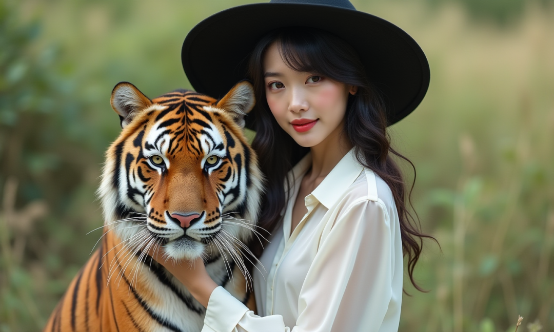Chinese girl,18-old-years,Model and tiger, tropical savanna,White and transparent dress, tiger-print dress, silk dress, black hat, Vogue style, wide-angle lens, natural light, soft tones, elegant poses, in harmony, fashion magazine editorial.chinese girl, 8k,raw photo,best quality,hp,sim,girl,wavy black hair,shoulder-length,white shirt,minimalism,soft lighting,