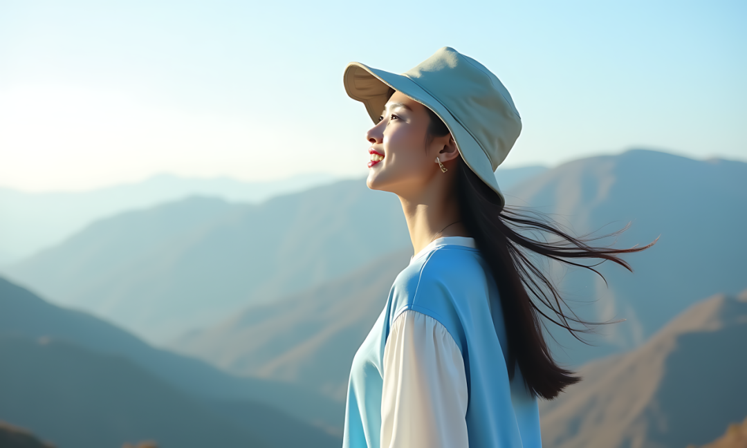 chinese girl, 8k,raw photo,best quality,hp,Chinese beauty, top of the mountain view, sunny, fresh and natural, dress, cold and high, long hair fluttering, medium shot, soft light, wearing a modern popular hat, blue and white color matching, happy mood.,in clothes