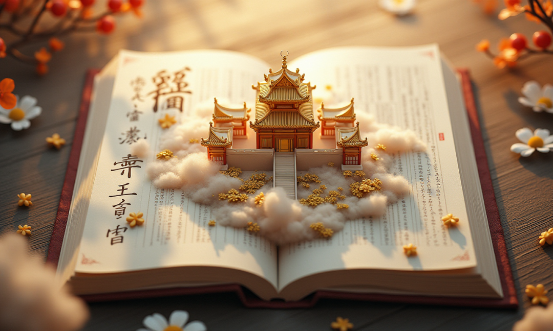 Aerial view of an open ancient Chinese book, with the left page featuring an ancient Chinese architectural design and the right page containing Chinese text. Above the book, there is a miniature fairyland city scene, with the book itself serving as the foundation. The city is shrouded in mist and clouds, and at its center stands a majestic Chinese-style golden palace crafted from gold. Rendered in 3D, the scene offers a bird's-eye perspective of an epic landscape with clear light and shadow contrasts, creating a dreamlike, surreal atmosphere. The overall composition is highly artistic and spatial, with delicate brushstrokes, smooth and flowing lines, reminiscent of traditional historical paintings, all rendered in 3D.