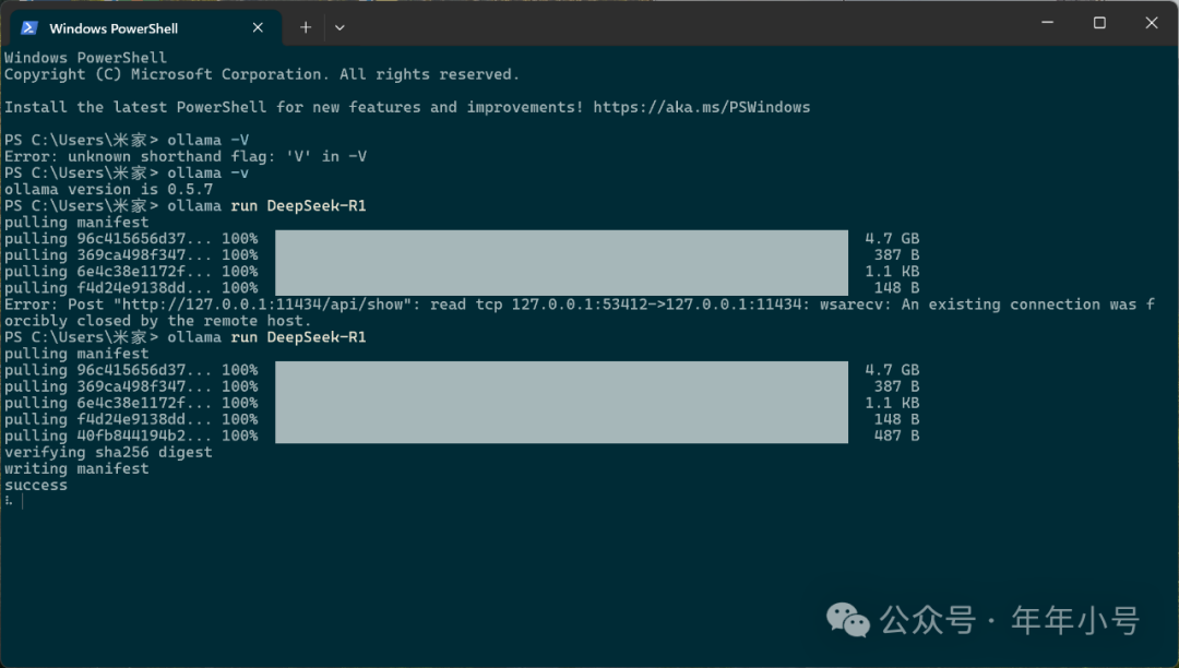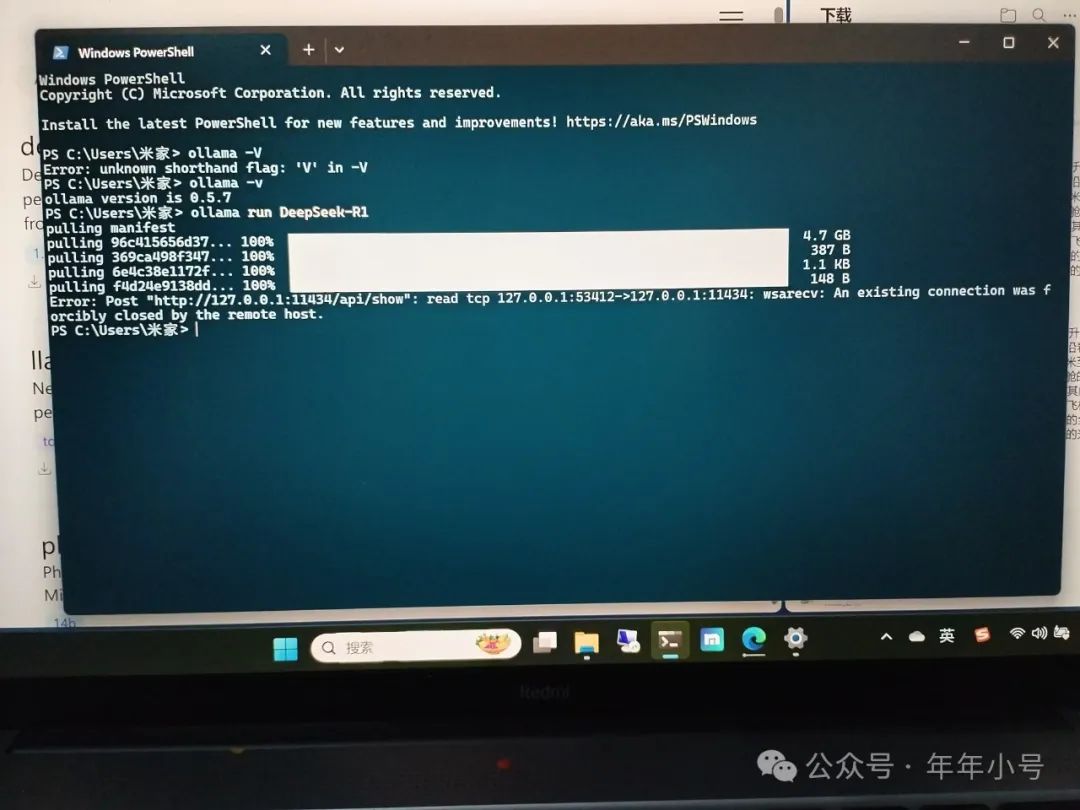 这里要稍微解释一下,DeepSeek的下载(也即其第一次安装+运行)过程,首先是一个4.7G的安装包的下载。刚才说的100%完成,就是这个4.7G的大文件。之后还有几个小的配置文件啥的,几乎都是秒过。一共有4个这样的小文件。