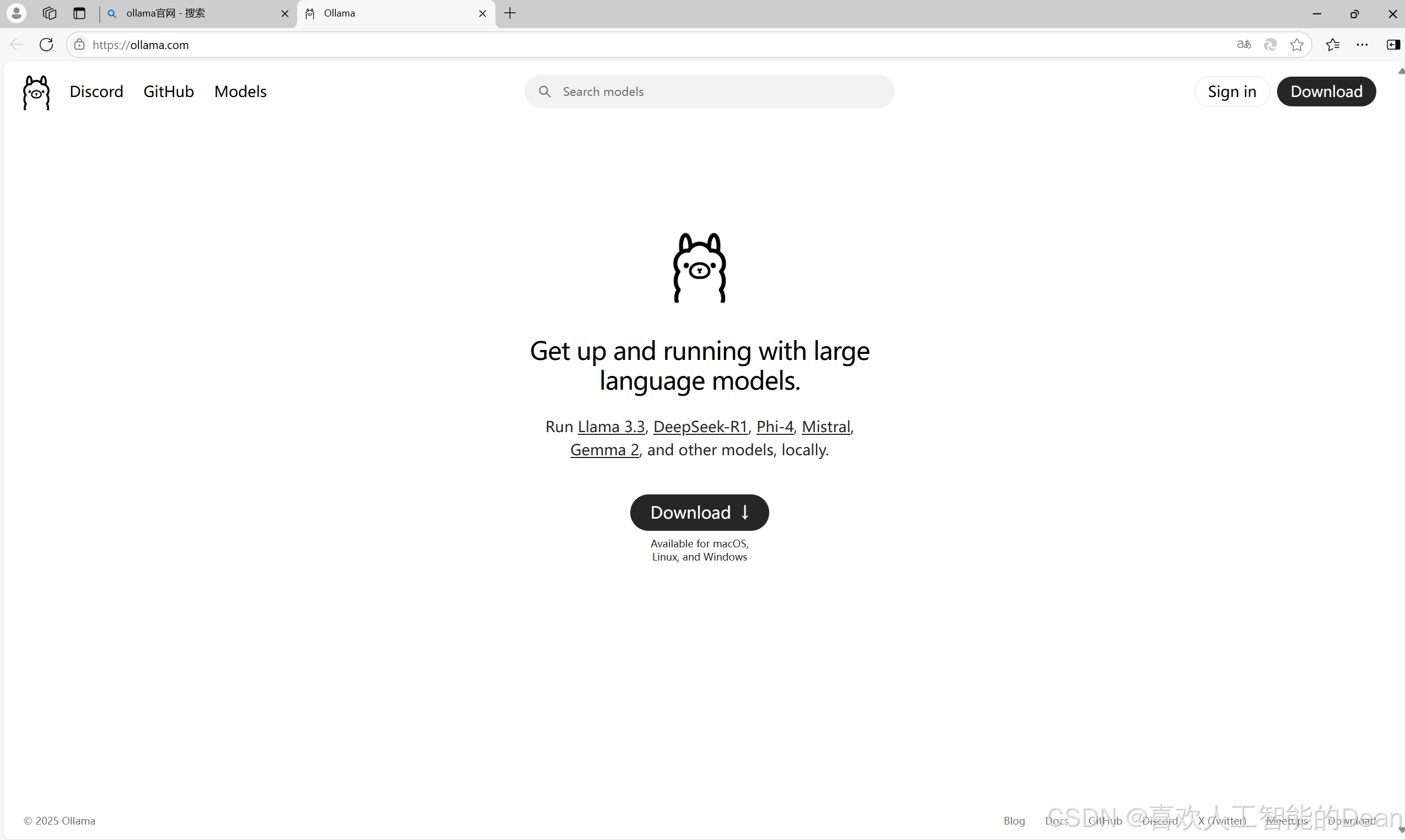 打开浏览器,在搜索引擎(如微软必应)中输入“ollama官网”,在搜索结果中找到Ollama官方网站(https://ollama.com ),点击进入。