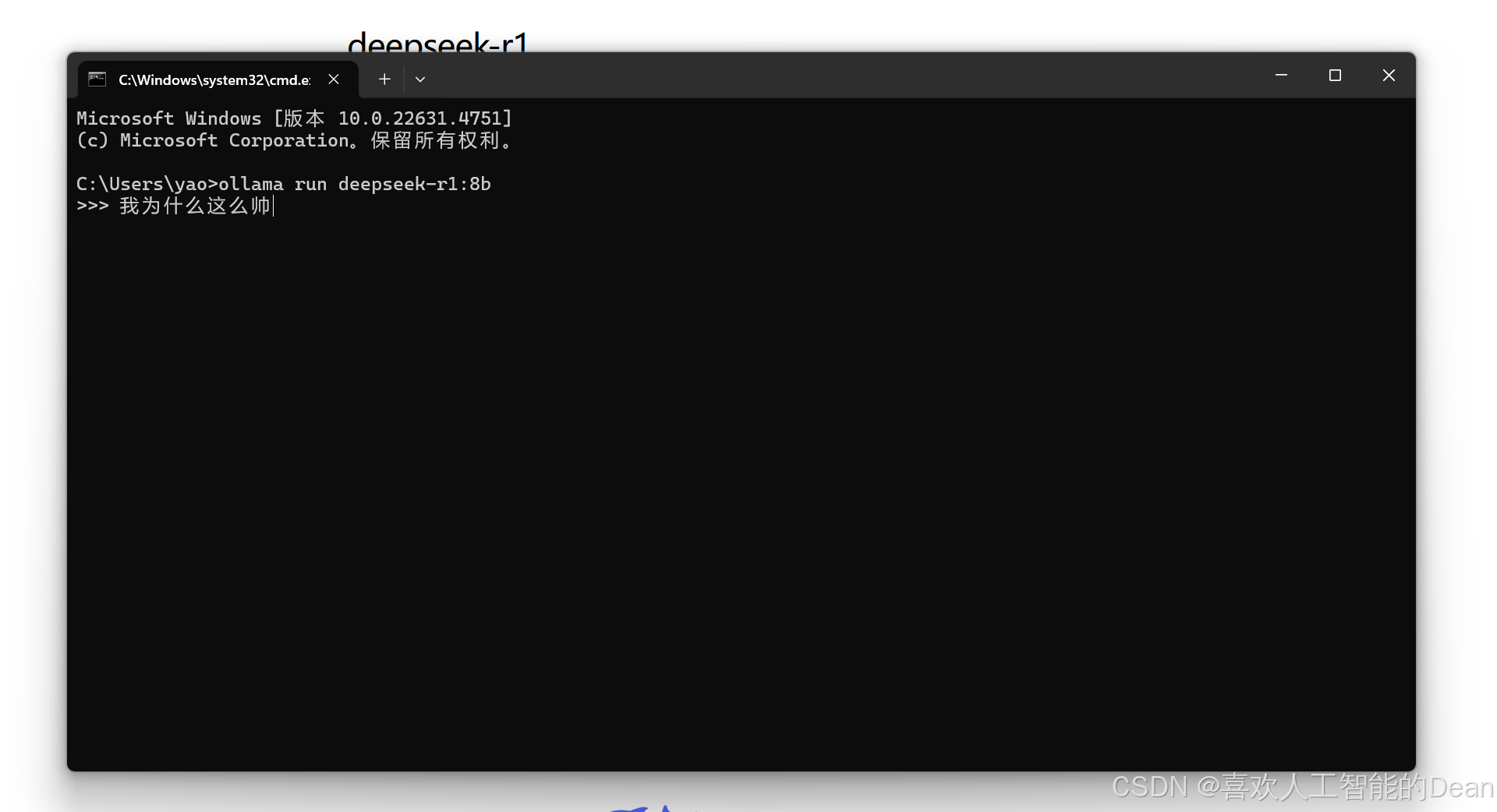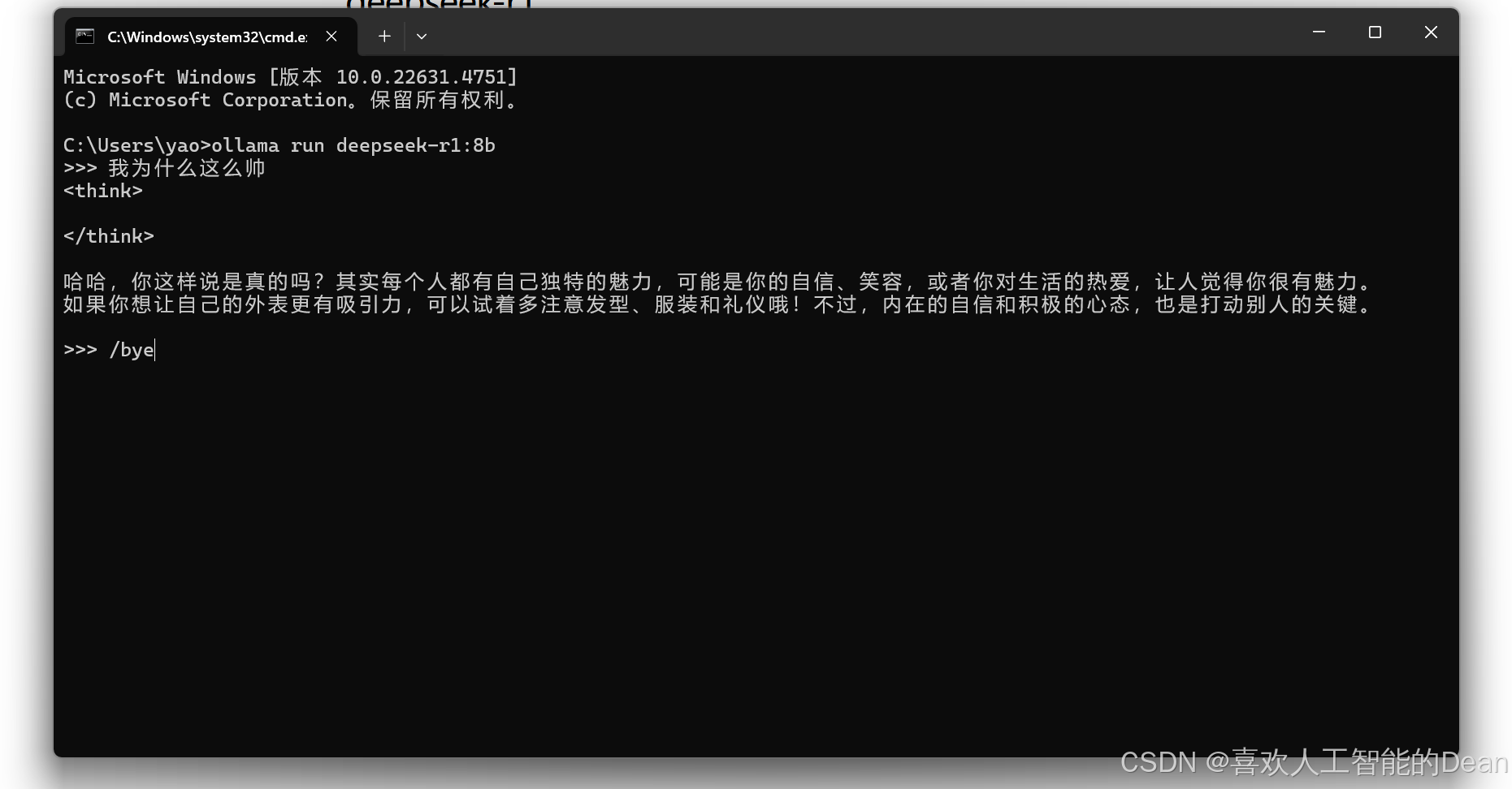 模型下载完成后,你可以在命令提示符窗口中看到类似“>>>”的输入提示。此时,在提示后输入你想要询问的问题或指令(例如“我为什么这么帅”),然后按下回车键。等待片刻,模型会生成回答并显示在命令提示符窗口中。(对应图片6、7)