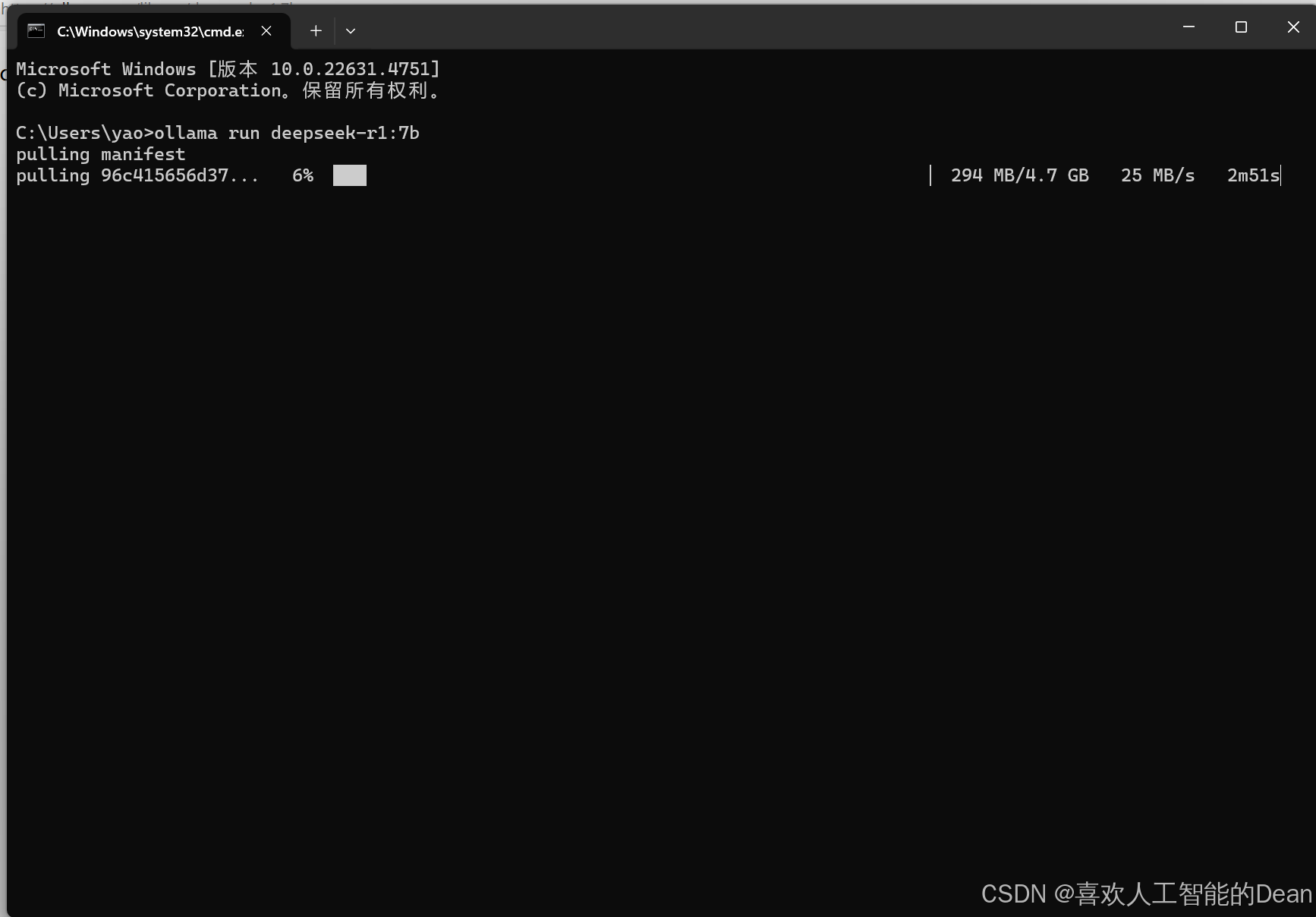 在命令提示符窗口中,输入之前在Ollama官网模型详情页获取的运行命令(例如“ollama run deepseek - r1:8b” ,根据你选择的具体模型版本而定),然后按下回车键。Ollama会开始下载你指定版本的DeepSeek模型(如果本地尚未下载),下载过程中会显示下载进度、已下载大小、总大小和下载速度等信息。