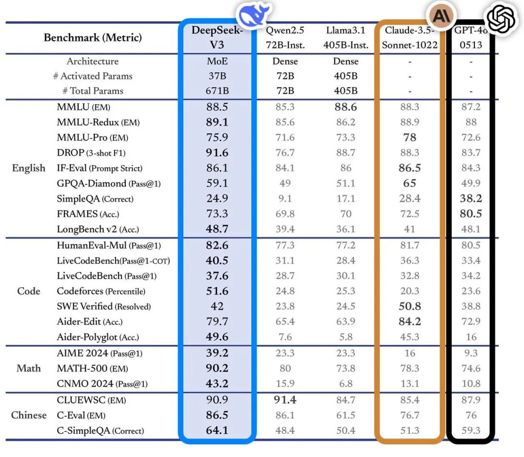 根据多个基准测试,DeepSeek v3 在代码方面甚至优于 Claude Sonnet 3.5