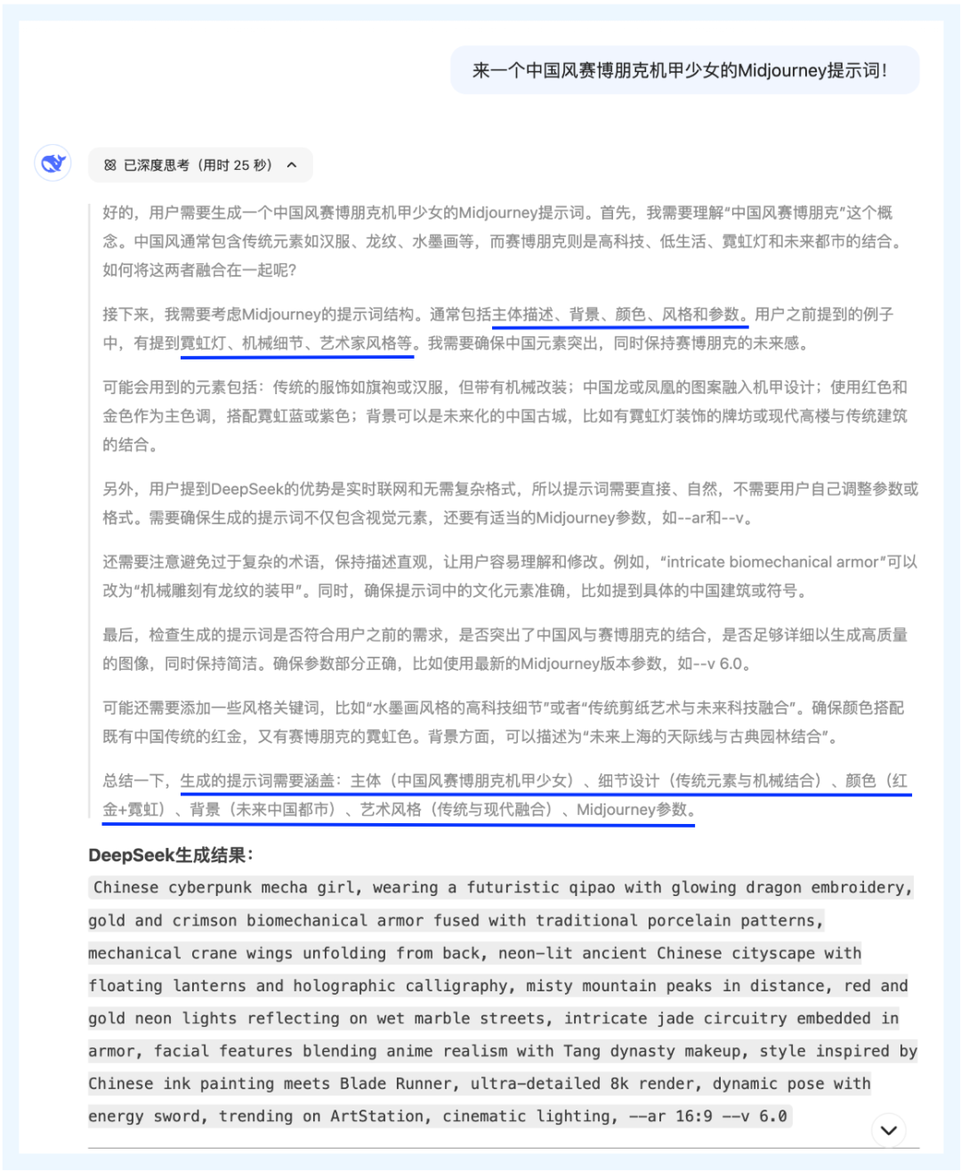 DeepSeek在结尾还机智地送了一个战损风咒语(对,它连提示词叫咒语的黑话都知道😂),如果不想要,还想要别的风格的提示词,可以直接再敲下一行字就可以,比如我想要一个中国风的赛博朋克机械姬⬇️直接在对话框输入: