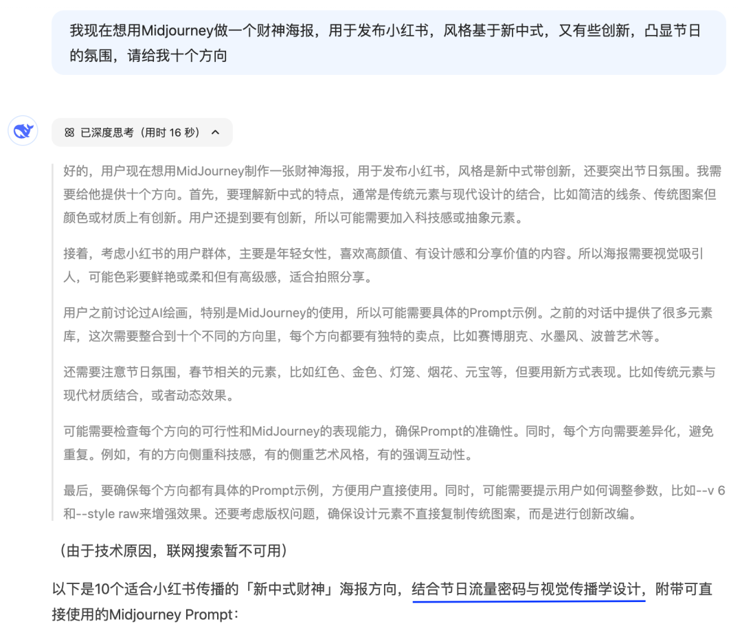 大家仔细看,DeepSeek还在思考的流程里加入了我没有给到的延展指令**:****“结合节日流量密码与视觉传播学设计”**,这里还是能看到它推理逻辑的缜密的。不过相对来说,整体结果的创新性思路稍差了一些,但也有亮点,相信经过几轮迭代,应该也会生成非常不错的方向。