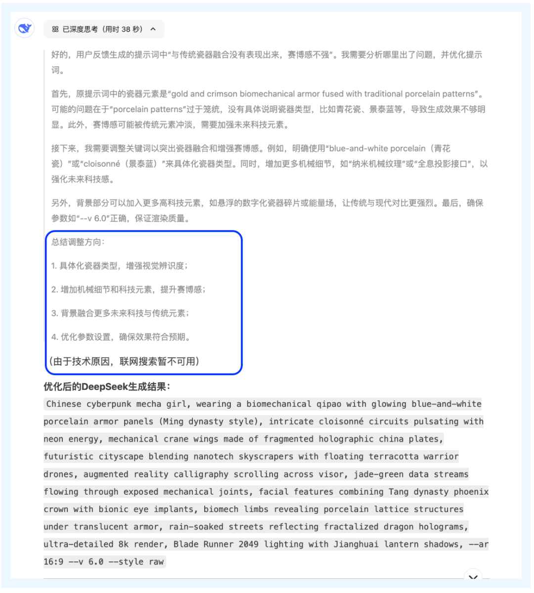 这一组提示词在刷图的过程中,发现出图在赛博的元素上表现不够强烈,尤其是在机械翅膀和瓷器的元素表现不够突出,同样,我们可以继续以对话式的方式给到DeepSeek指令,进行优化提示词⬇️