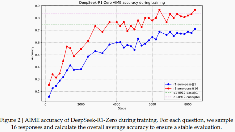 图7: DeepSeek-R1-Zero在AIME 2024基准测试中的表现。随着强化学习的进行,DeepSeek-R1-Zero的表现稳步提升。