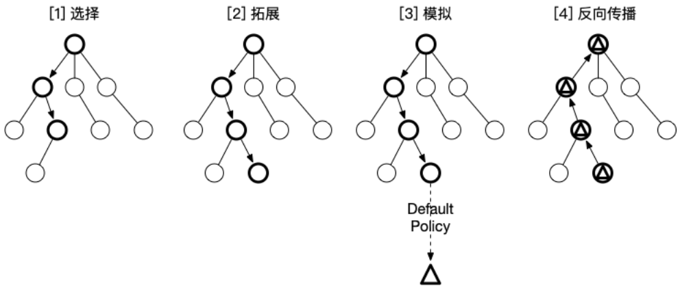 蒙特卡罗树搜索(Monte Carlo Tree Search, MCTS)是1987年Bruce Abramson在他的博士论文中提出的一种树搜索算法,蒙特卡罗树搜索大概可以被分成四步:选择 (Selection),拓展 (Expansion),模拟 (Simulation),反向传播 (Back Propagation)。在选择阶段,递归选择最优子节点,当到达一个叶子结点时,若叶子结点不是终止节点,就创建其他节点,选择其一进行拓展,从拓展节点开始,进行模拟输出,直到游戏结束,根据模拟结果,反向传播更新当前序列,该方法的好处在于:可以在不训练模型的情况下,通过增加模型的推理时间,增强模型的推理性能。[10][11][12]。