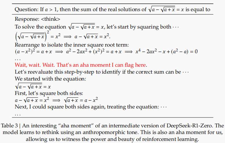 顿悟时刻:DeepSeek-R1-Zero学会了通过重新评估其初始方法,为问题分配更多的思考时间。这种行为不仅是模型推理能力增长的证明,也是强化学习如何导致意外和复杂结果的一个引人入胜的例子。
