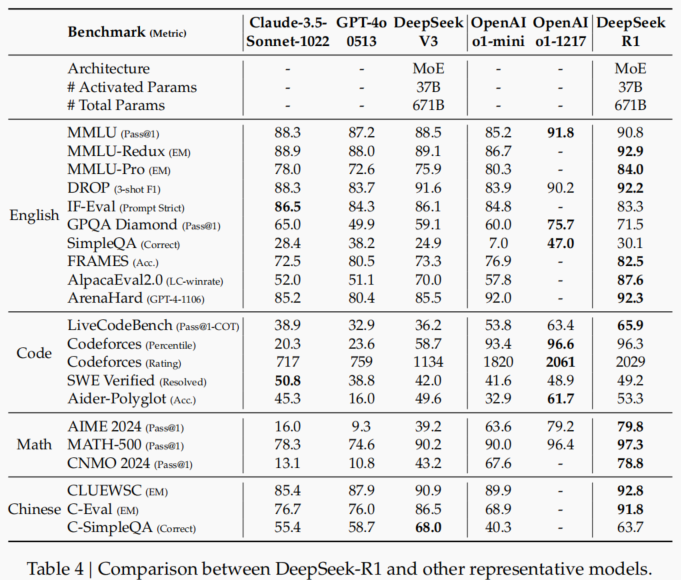 图1:DeepSeek-R1的Benchmark表现