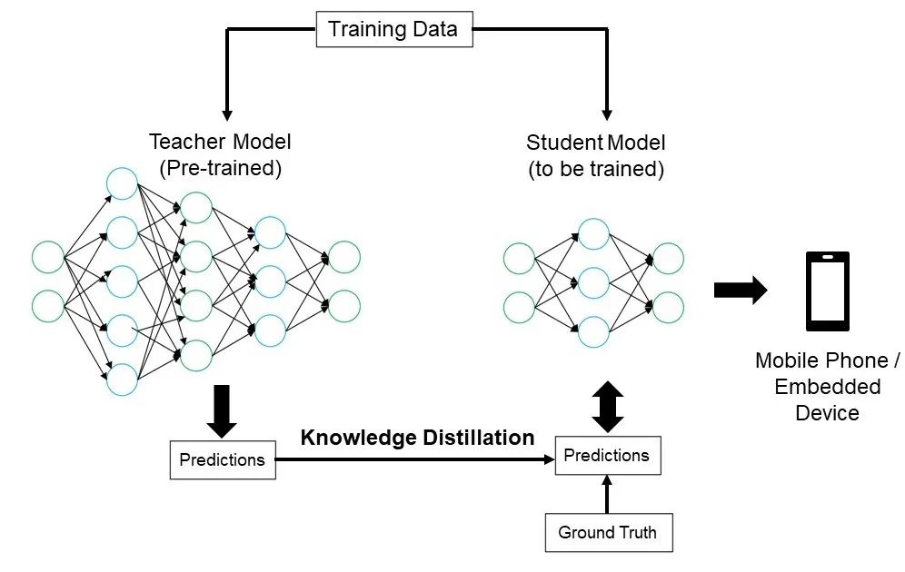 蒸馏完成后,学生模型被部署到资源受限的设备上,如图中所示的手机或嵌入式设备。