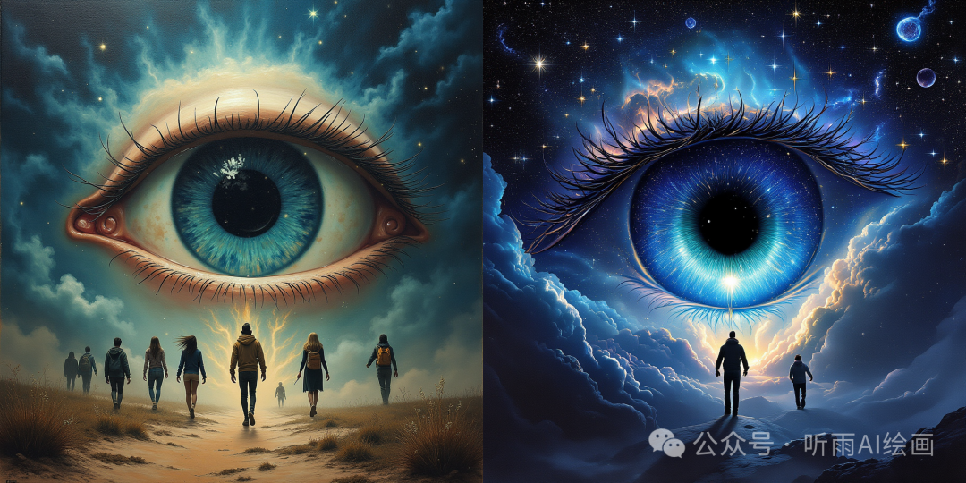提示词:几人正试图进入一个大眼睛,油画,空灵的幻想概念艺术宏伟的天空空灵的绘画史诗雄伟的神奇幻想艺术封面艺术梦幻,照片由哈苏X1D-50c用18-55mm STM镜头超复杂的细节和纹理16k最大分辨率可达600dpi,风格由伯纳德·巴菲特,极其美丽的杰作比赛冠军超细节高分辨率,Fujicolor Superia X-TRA 400,Bloom light