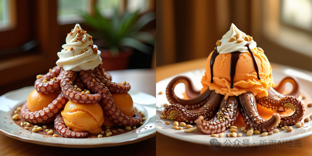 提示词:制作一个视觉上令人惊叹的章鱼冰淇淋圣代,放在一个优雅的盘子里。圣代的特色是几勺橙色冰淇淋,上面有逼真的、不同深浅的棕色,还有(装饰着卷起的触手碎片:3)。在上面撒上鲜奶油,淋上巧克力酱,撒上各种坚果。确保背景是温暖的室内环境,柔和的自然光透过,营造出舒适、温馨的氛围。构图应该光线充足,突出冰淇淋和触手的质地和颜色,使其看起来美味可口,视觉上引人入胜。,清晰聚焦、超精细摄影、杰作、最佳质量、高质量、高分辨率、超精细、最佳质量,8K,高分辨率,极端细节,(优秀构图:1.4)