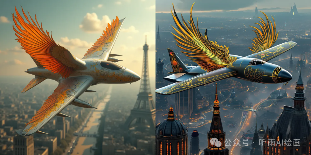 提示词:现代青年风格喷气式飞机的概念艺术,带有装饰艺术图案的华丽凤凰翅膀,飞越赛博朋克巴黎、柴油朋克、高幻想