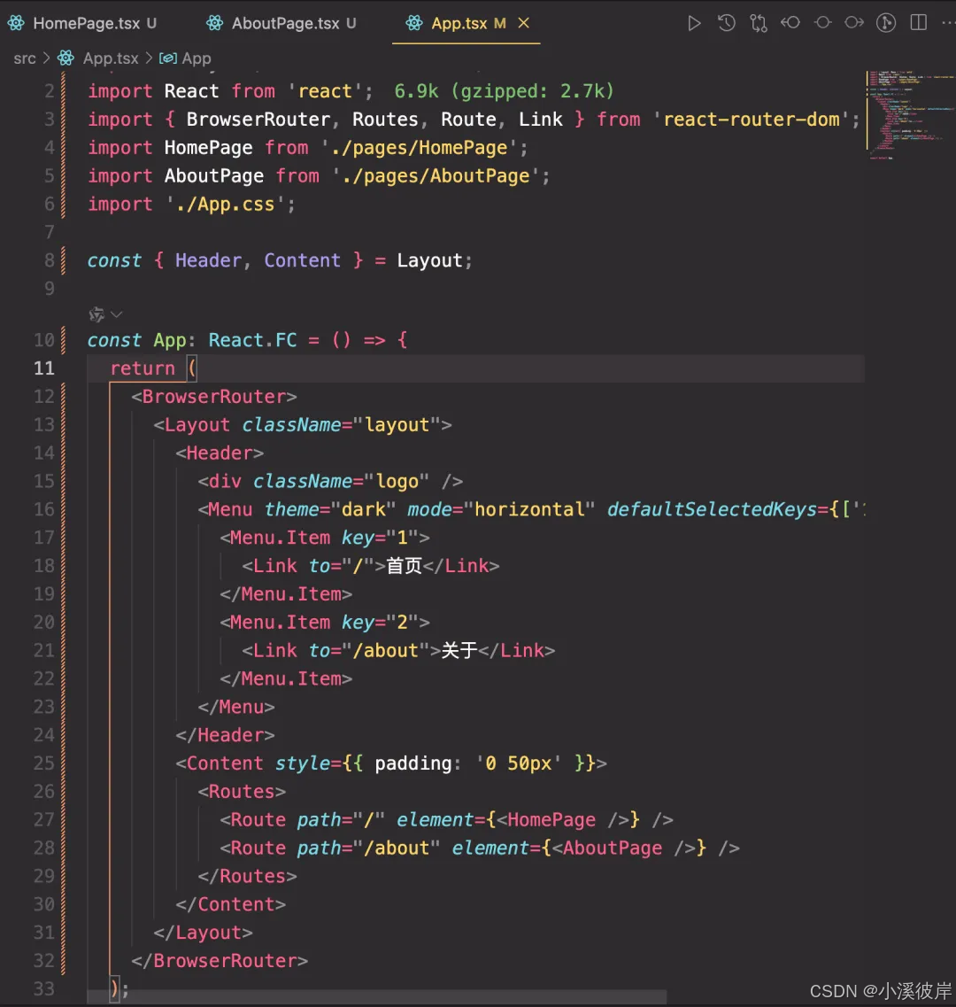 请为我新增Home和关于页面并使用react-router完成路由跳转,在@/src/App.tsx文件中可以自由切换Home和关于页面
