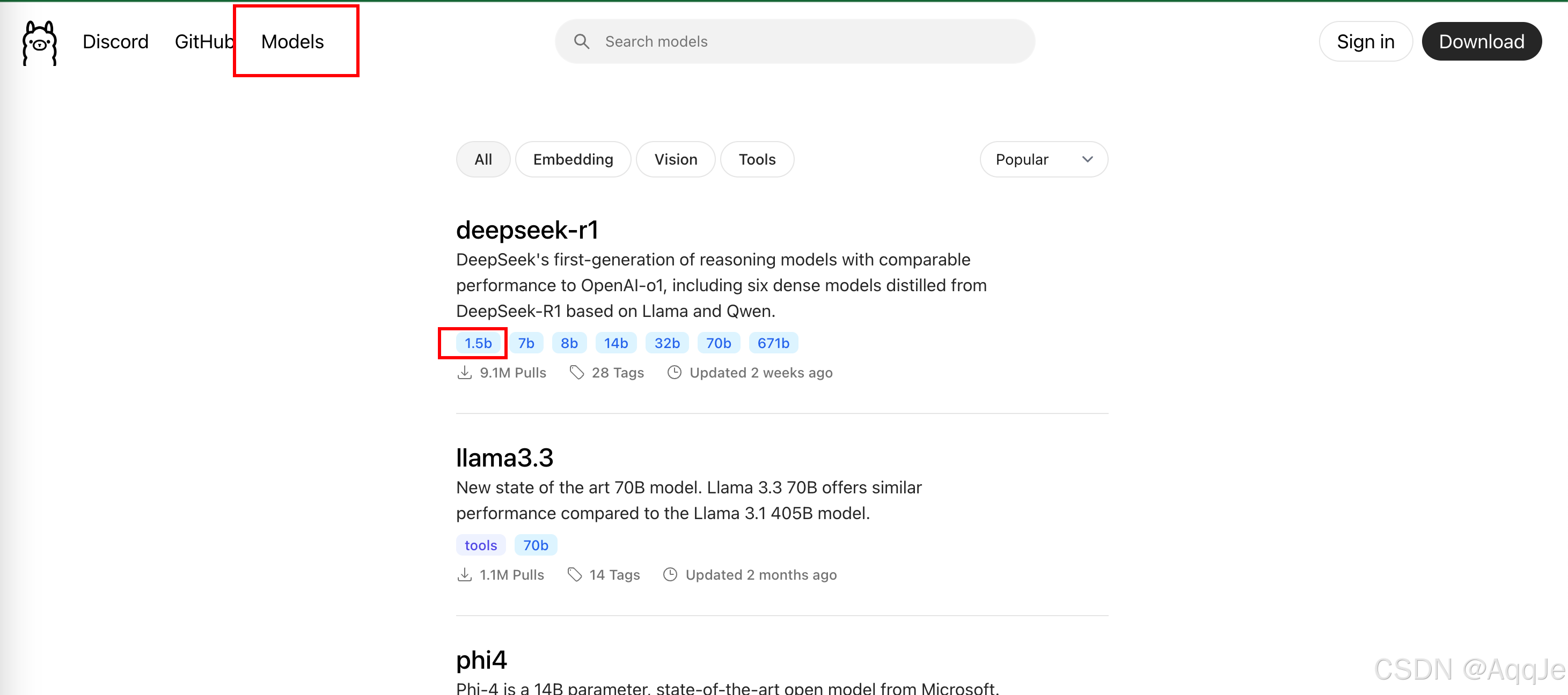 刚开始不必要下载所有模型,可以先下载最轻量的模型 deepseek-r1:1.5b。