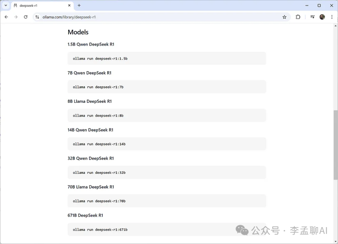 点击它后,在“模型”部分,你会注意到有多个模型尺寸,参数量从50亿到6710亿不等。作为一个经验法则,较大的模型需要更强大的GPU来运行。
