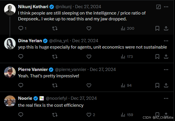 DeepSeek-V3的发布在社交媒体上引发热烈讨论,许多业内人士对其性能与成本的平衡表示赞叹: