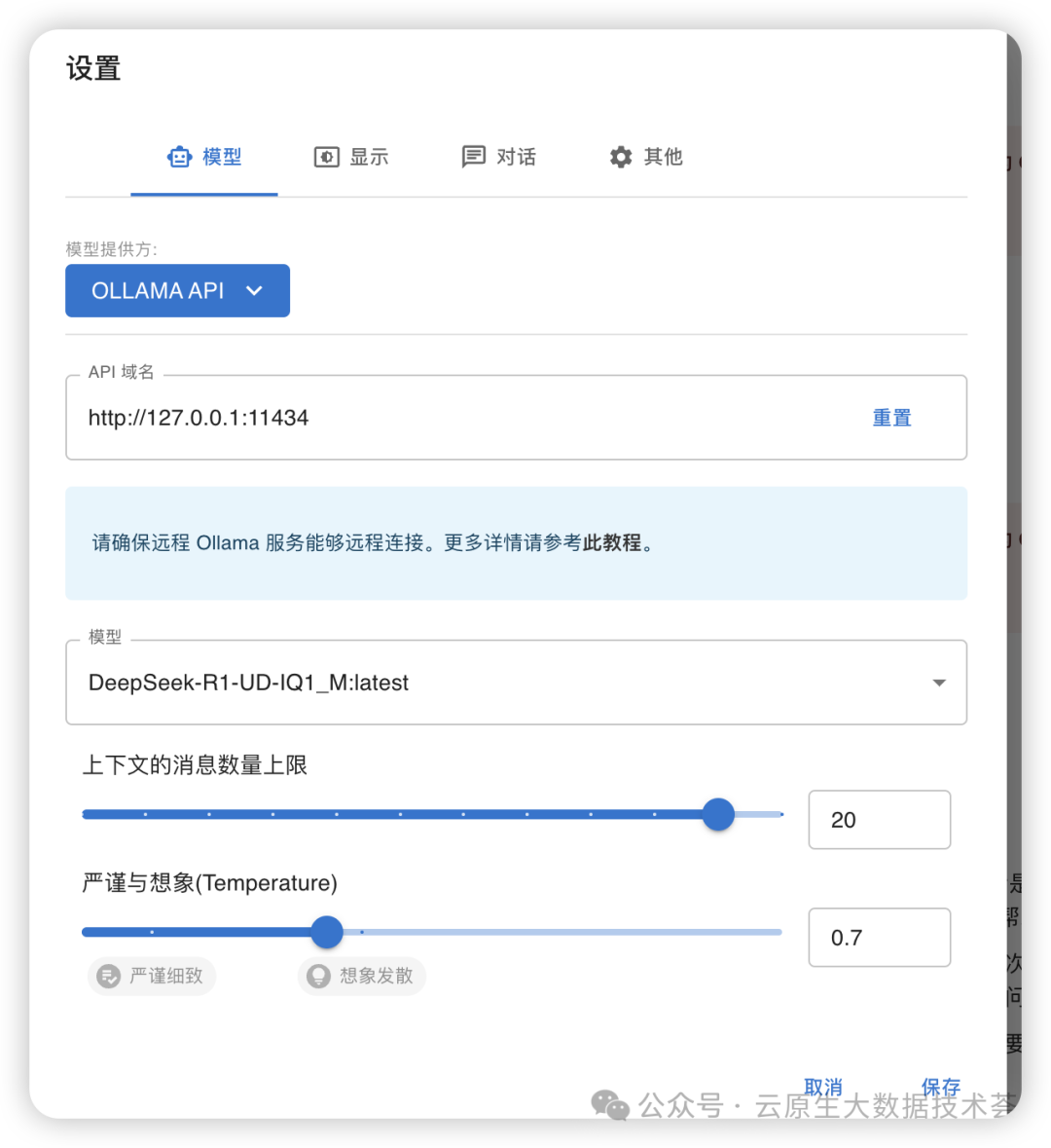 这里我通过本地电脑安装了一个chatboxai ,安装完成之后,在配置中指定ollama的API地址和端口,端口号默认是11434 (如果是远端地址,记得防火墙放开)。