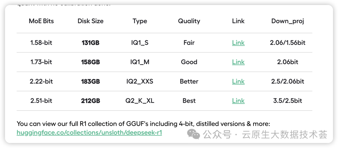 在这里我们可以选择 Unsloth AI 的动态量化版本,具体可以参阅:deepseekr1-dynamic
