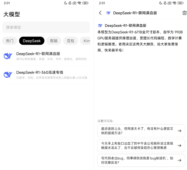 不过网页版好像没法使用deepseek r1模型,只能去下载手机的APP才可以体验到。