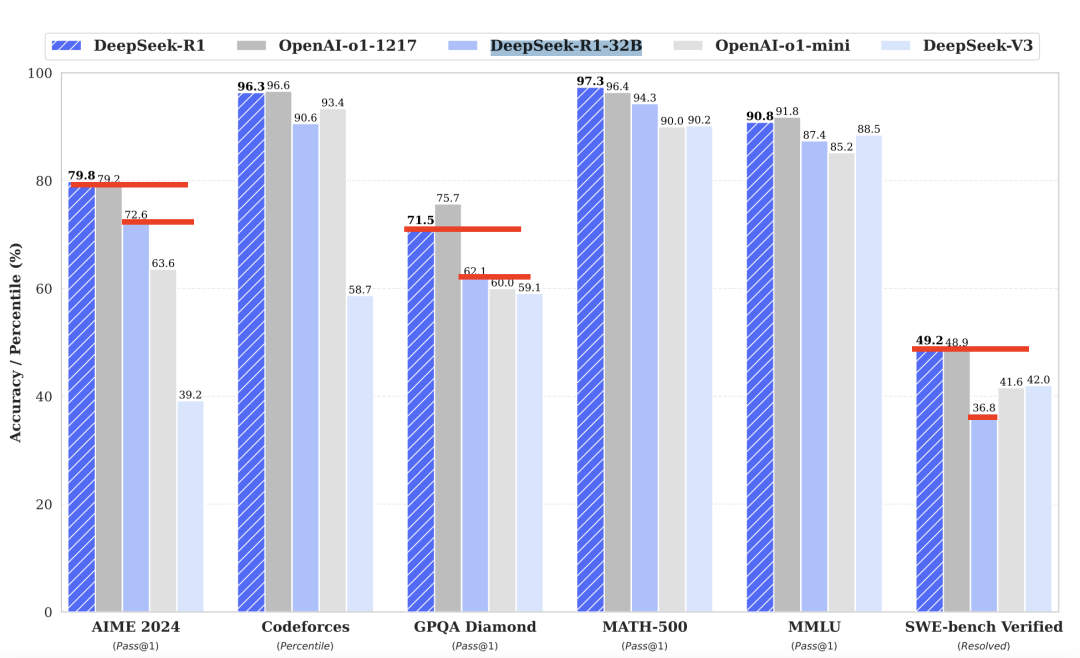 在使用DeepSeek时,有些读者可能好奇或忽视了一个很重要的问题,就是DeepSeek有不同的模型尺寸,如下截图来自DeepSeek-R1论文,划线所示的6个尺寸,像1.5B,7B,再到70B这些都是DeepSeek-R1蒸馏版本,也就是小尺寸版本。然而我们常说的DeepSeek-R1它的实际尺寸为671B,是蒸馏最小1.5B版本的447倍,是蒸馏版本32B的21倍。