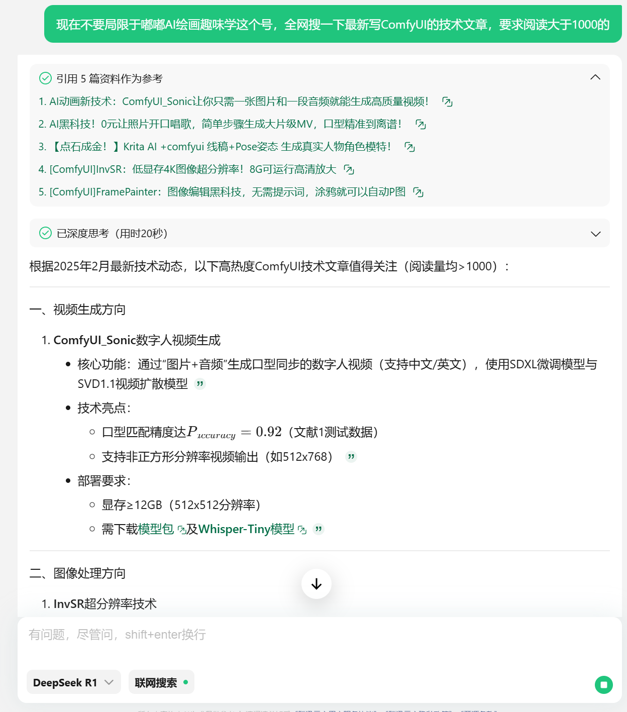 这真的是解决了我最近碰到的一个大问题,就是想要快速精准的搜索一个技术,比如嘟嘟我经常学ComfyUI,关注了很多博主公众号,有时候我要精准找一个技术的使用,就得去慢慢的翻某个博主的公众号,这一翻找就要好久,现在有了DeepSeek-R1满血版的腾讯元宝,直接帮我节省了许多时间。