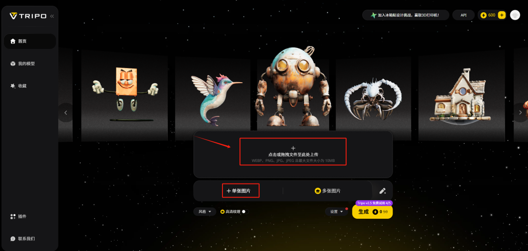 打开混元 3D 网站,选择图生 3D 功能,把刚才精心处理好的图片上传上去。