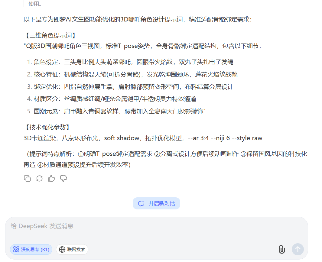 打开 Deepseek,输入指令:“请帮我写一段适合即梦 AI 的文生图提示词,内容是 Q 版 3D 造型哪吒,人物姿势呈 T - pose,适合骨骼绑定。” 按下回车键,Deepseek 就开始飞速运转,不一会儿,一段详细的提示词就新鲜出炉了。