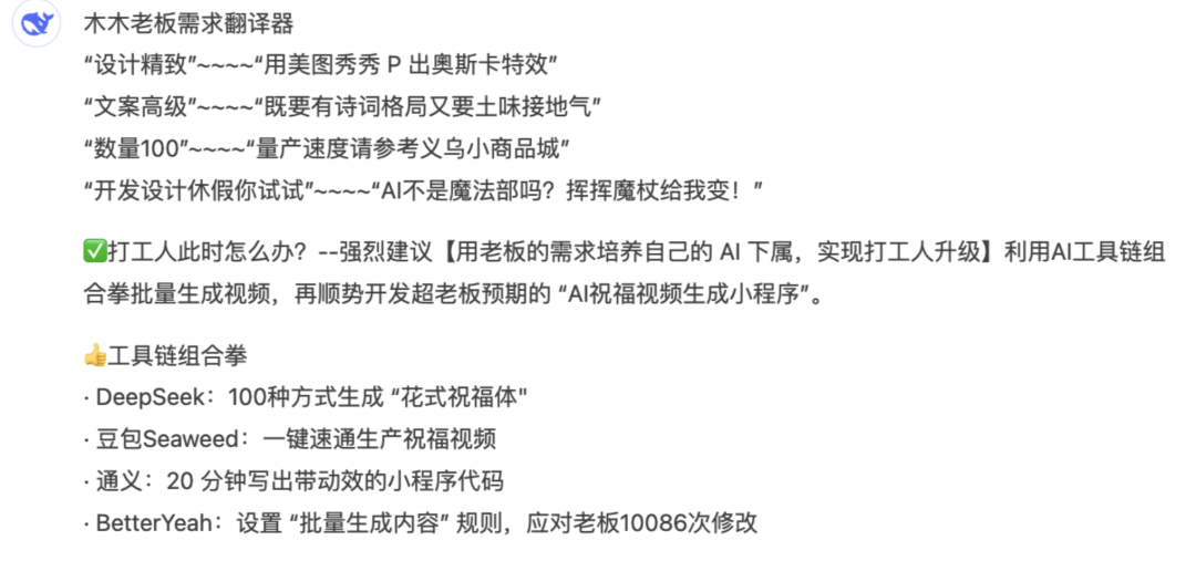 带着复工的三分懵逼和收到需求的四分无语,我打开了DeepSeek(打工人嘴替)。