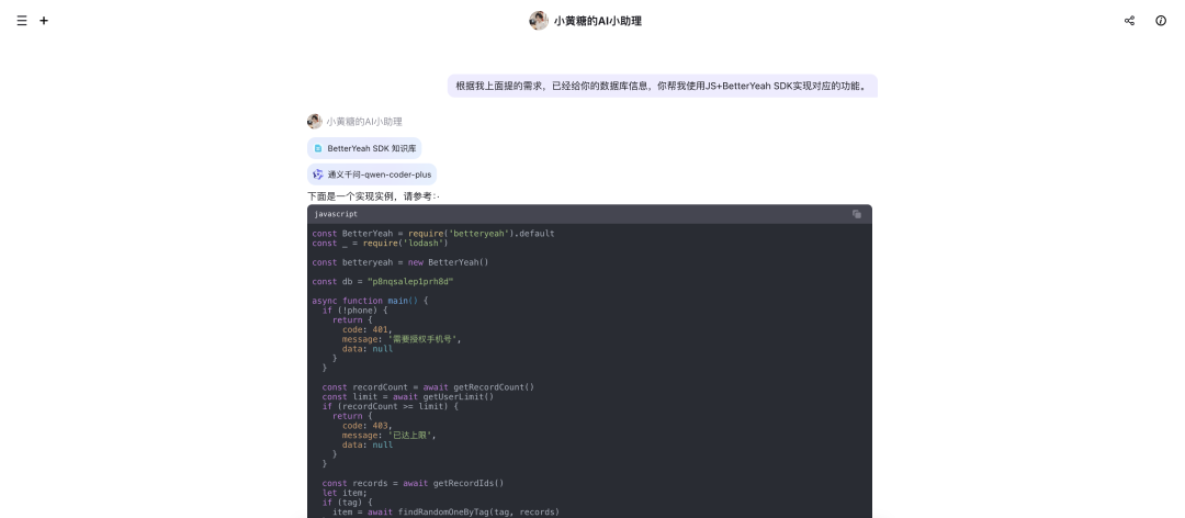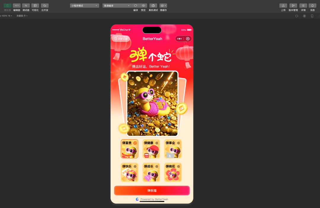 1、供给侧:在BetterYeah Agent 平台,调用豆包Seaweed、DeepSeek、通义Qwen-coder-plus分别批量生成祝福视频、文案、「弹个蛇」小程序前端页面框架,并对数据、调用进行管理。与蛇年有关,用户可以抽签生成,设计精致点、文案高级点,先搞 100 个。3、将已经批量生成的视频、文案等内容,导入到BetterYeah 平台数据库、数据表中,获取每个图片、视频可被小程序
