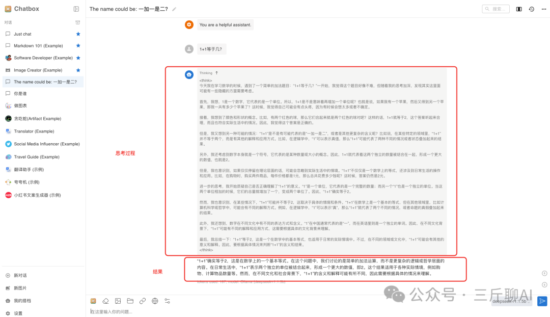 比如我问它 “1+1等于几?”,它会思考,并给出结果。