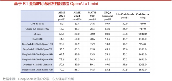 DeepSeek采用模型蒸馏技术,极大提升模型推理能力。DeepSeek官方技术文档显示,研究人员使用DeepSeek模型遴选了80万个样本,并且基于DeepSeek-R1模型的输出对阿里Qwen和Meta的Llama开源大模型进行微调。评测结果显示,基于DeepSeek-R1模型蒸馏的32B和70B模型在多项能力上可对标OpenAI o1-mini的效果。DeepSeek研究结果表明,蒸馏方法可以显著增强小模型的推理能力。