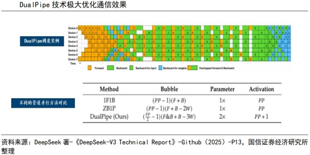 DualPipe技术优化通信成本。在大规模分布式训练系统中,每个计算节点需要频繁地与其他节点交换信息,导致部分时间在等待数据的传输,计算资源不能持续进行数据处理,资源利用率低下。以DeepSeek -V3为例,在模型训练时跨节点的专家并行性带来的通信开销导致计算与通信的比率约为1:1。为了解决这一问题,DeepSeek在单独的前向和后向块内部重叠计算和通信,通过采用双向管道调度,同时从管道的两端供给数据,使大部分通信可以完全重叠,从而实现通信成本的降低。