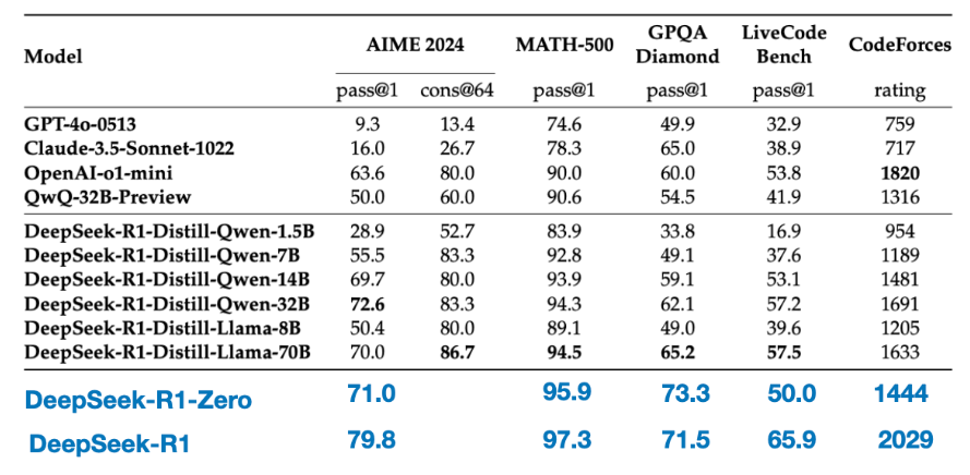 最终的模型,DeepSeek-R1 在性能上相较于 DeepSeek-R1-Zero 有显著提升,如下表所示。