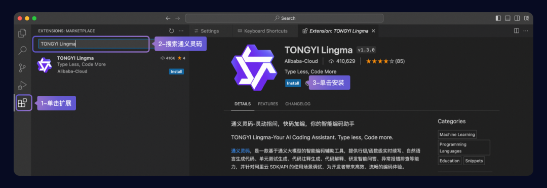 打开 Visual Studio Code 扩展窗口,搜索 TONGYI Lingma,找到通义灵码后单击安装。