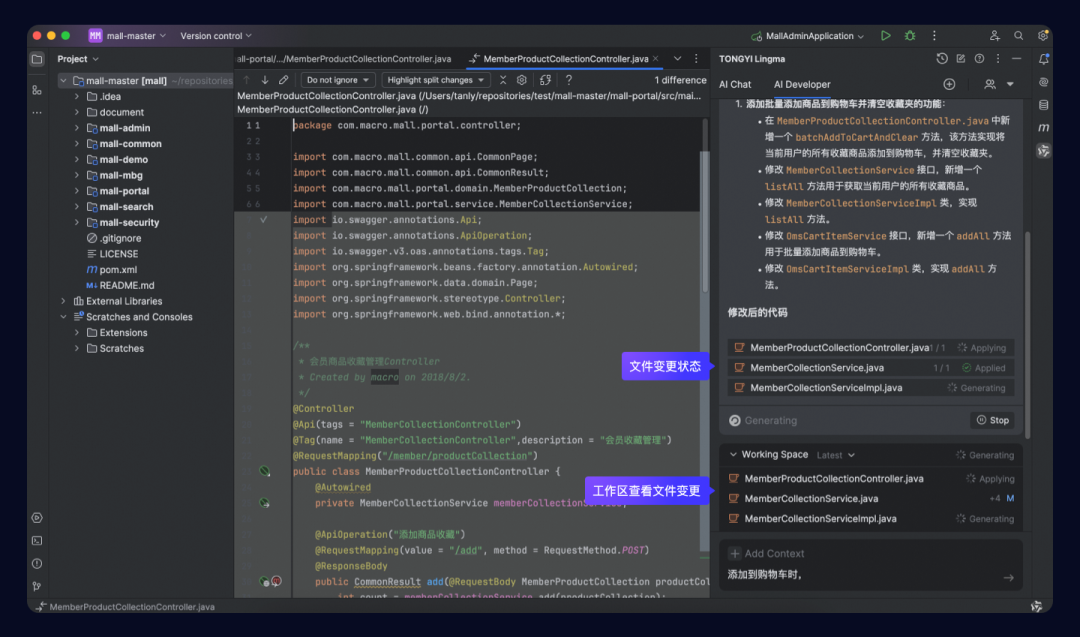 AI 程序员完成的代码变更文件将聚合在工作区,方便开发者进行查看和操作。