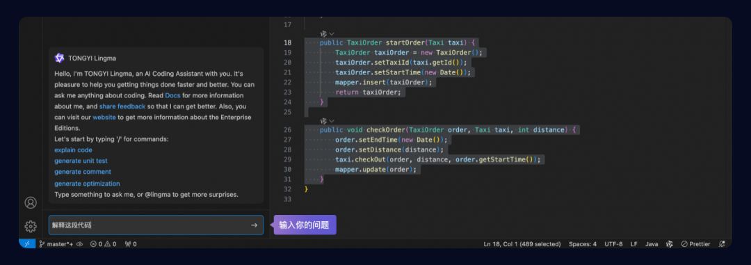 选中代码,开始输入您的问题,通义灵码将围绕着选中代码与您开展对话;