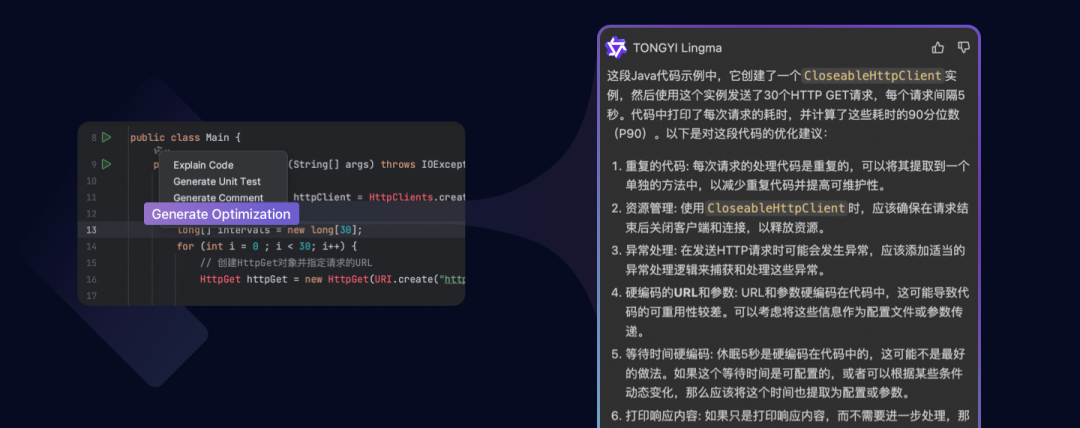 通义灵码提供多处触发单元测试生成、代码解释、生成代码注释、代码优化功能的入口,当您选中的代码后,有 3 种触发方式: